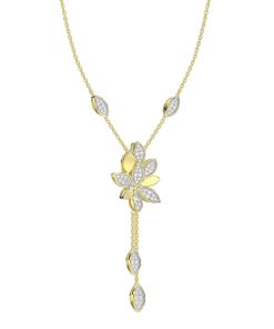 The Wild Flower Yellow Gold Y Necklace is an 18 karat yellow gold chain with a dynamic teardrop-shaped diamond and yellow gold flower at its center. The chain is adorned with almond-shaped natural diamond accents.