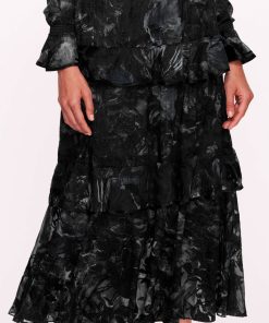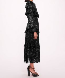 The Diantha Dress is a tea-length dress featuring a ruffled long sleeves and tiered ruffle skirt. Diantha is crafted with burnout satin and completed with smocking details and a rope tassel necktie.