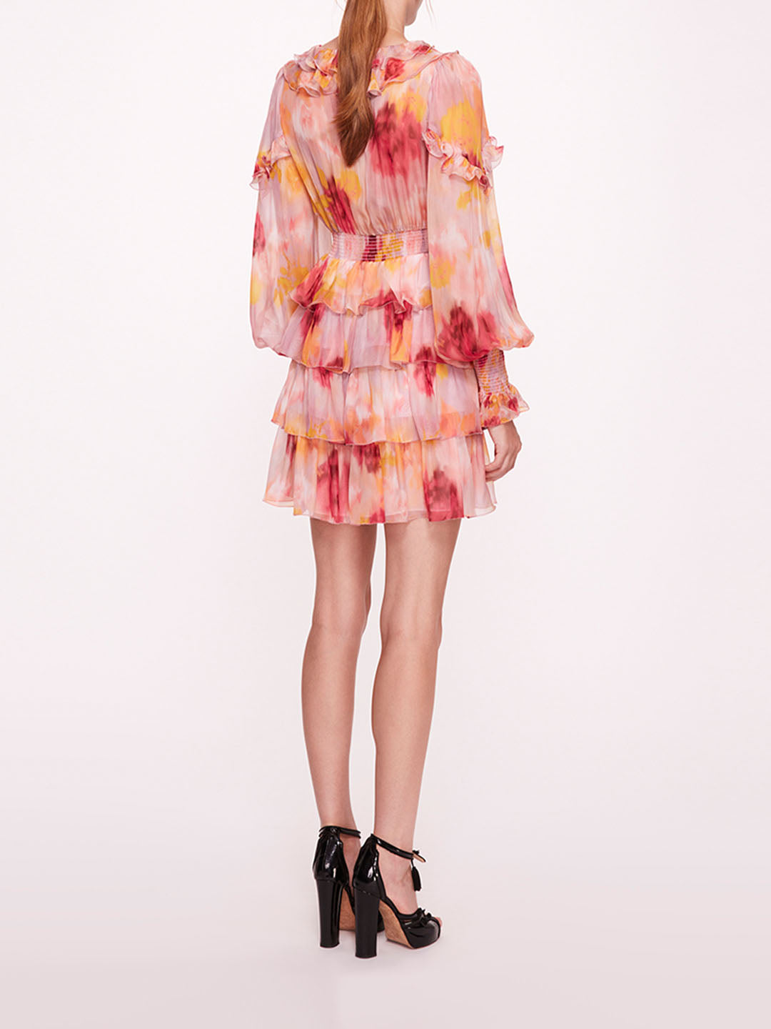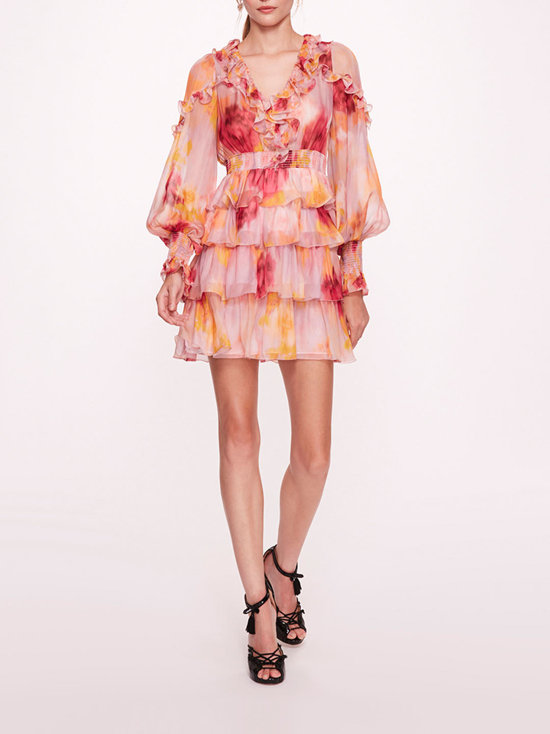 The Orchid dress is a v-neck domain sleeve ruffled tiered mini dress in silk