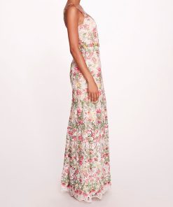 The Alexis Gown is a sleeveless fit-to-flare multi color guipure gown on solid ground.
