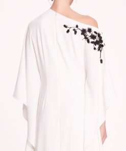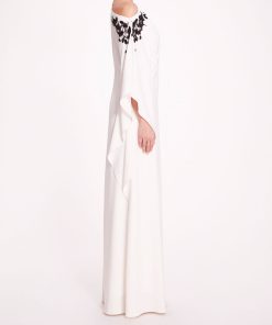 Elevate your wardrobe with the Embroidered Draped Kaftan, a fusion of effortless chic and luxurious detailing. Crafted from fitted stretch crepe, the kaftan features jeweled floral embroidery detailing on the shoulder, adding a touch of opulence to its relaxed silhouette.