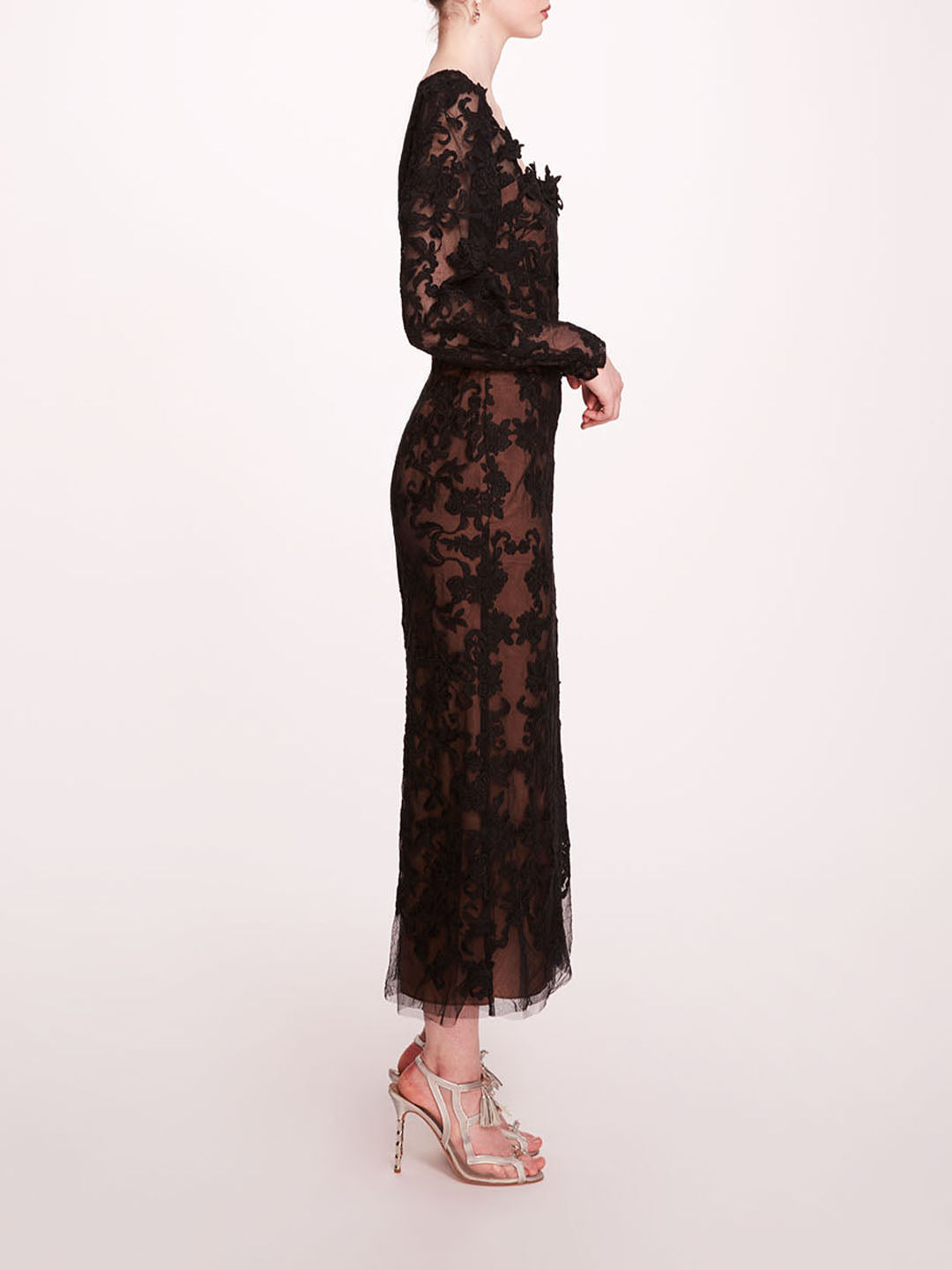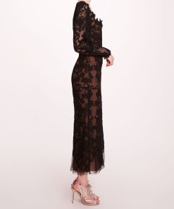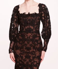 Step into sophistication with the Long Sleeve Corded Midi Dress, featuring intricate corded lace and enchanting floral appliqué detailing. The cinched sleeves and corset boning create a flattering silhouette that adds a touch of feminine charm.