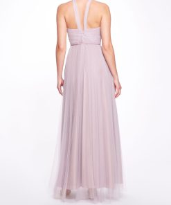 The Marine gown in rose gray is a picture of glamor. Featuring full-length tulle, a ruched keyhole halter neck, tulle bodice shown with a tie ribbon waist, this dress is chic and flowy.