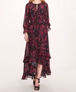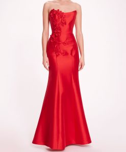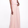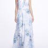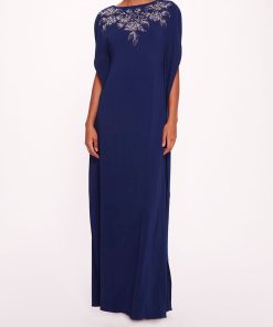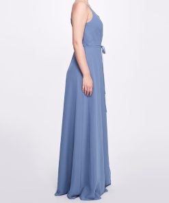 The Sessa gown in slate blue blurs the line between geometric and organic shapes. The v–neck drape halter gown features a triangular cutout on the back, a single mid-thigh leg slit, and finished with an elongated waist tie to give notice to the natural curve of your figure.