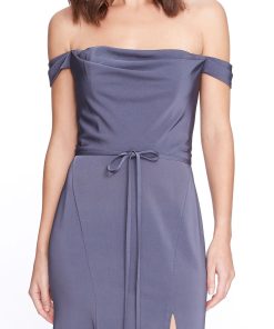Marchesa Notte Bridal Women’s Eveningwear Steel Blue Off The Shoulder Satin Cowl Neck Gown | Steel Blue