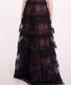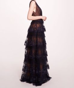 Marchesa Notte Bridal Women’s Eveningwear Tiered Terrarium V-neck Gown | Midnight